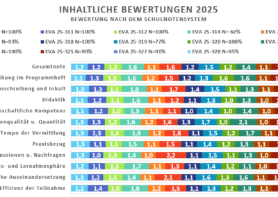 - Sobald die Evaluation der einzelnen Veranstaltungen abgeschlossen ist, werden die Ergebenisse auf dieser Seite unserer Homepage veröffentlicht – in der Regel wenige Tage nach Veranstaltungsende.