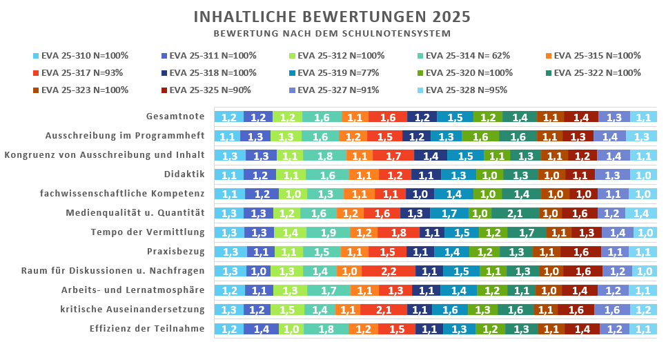 - jede Seminarausschreibung erhält eine Evaluations-Veranstaltungsnummer – z.B. EVA 24-295′ . Mit Hilfe dieser Nummer können bei Bedarf die in unseren Übersichten abgedruckten Daten den jeweiligen Seminaren zugeordnet werden. Die Nummerierung erfolgt in chronologischer Reihenfolge.
