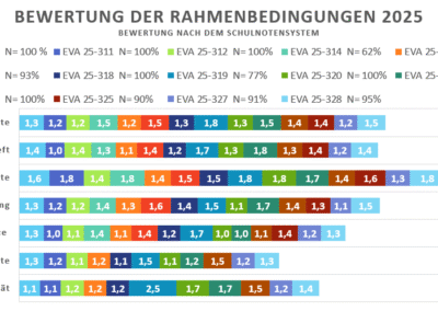 - Die Bewertung erfolgt nach dem Schulnotensystem bzw. einer Bewertungsskala. Am Ende jeden Abschnittes besteht für die Teilnehmer:innen die Möglichkeit, zusätzliche Bemerkungen/Anregungen beizufügen. Diese gehen aus Praktikabilitätsgründen jedoch nicht in die hier in Diagrammform veröffentlichten Ergebnisse mit ein.